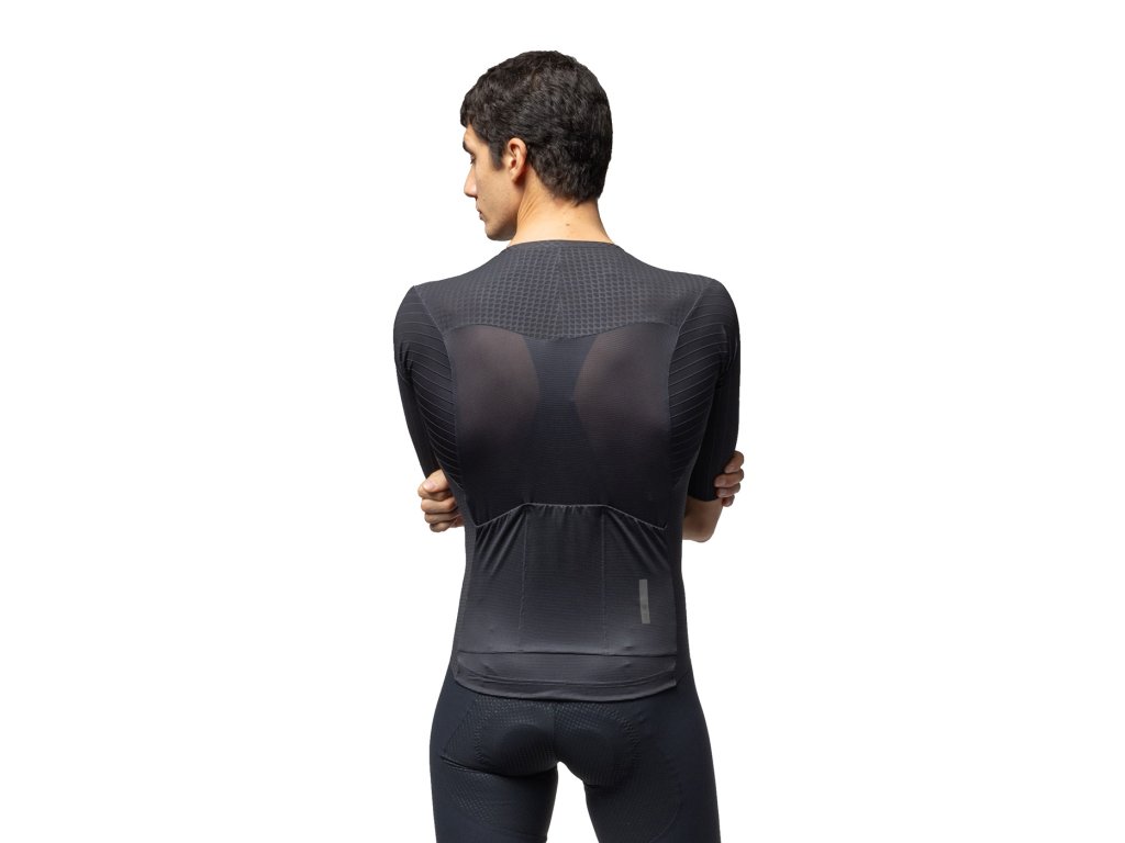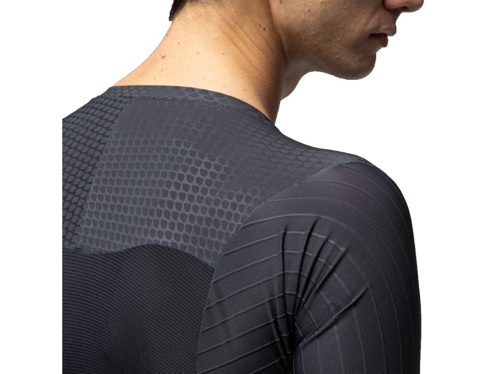JET STRIPES: Rukávy a ramená Vyrobené s 3D, kanálikovou textúrou, ktorá generuje kontrolované mikroturbulencie na zníženie odporu vzduchu v kľúčových bodoch. Ergonomický strih s ramenami a rukávmi v tvare krídla maximalizuje aerodynamický výkon.