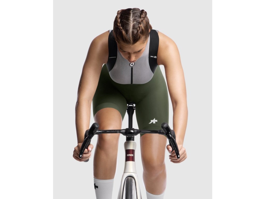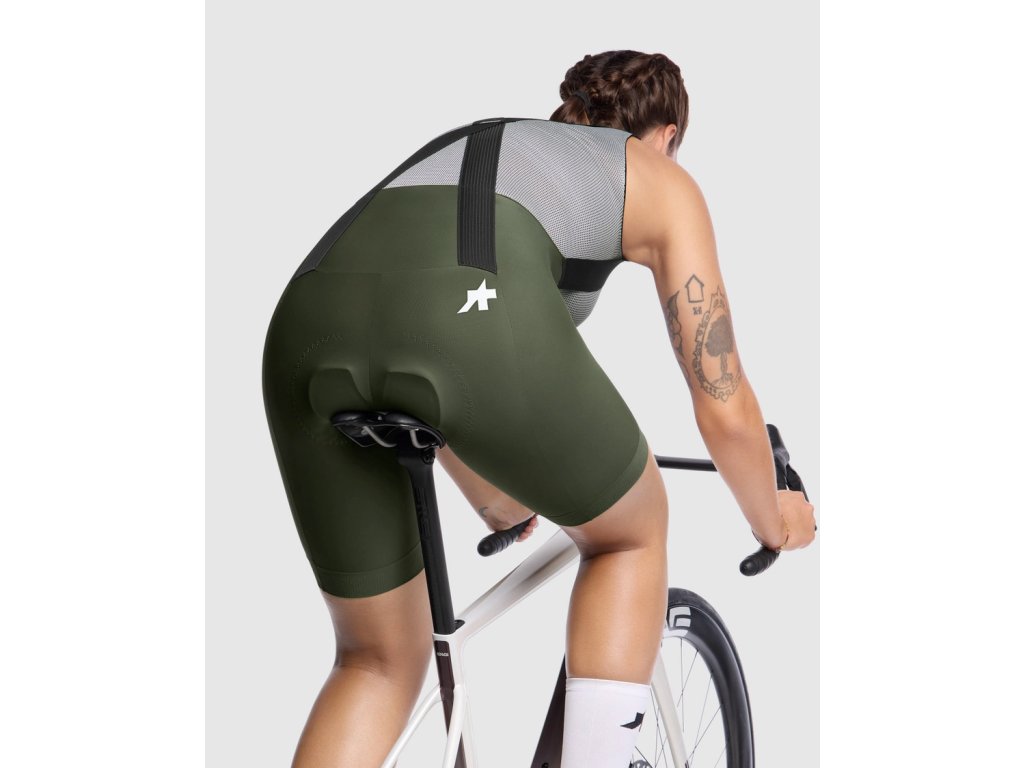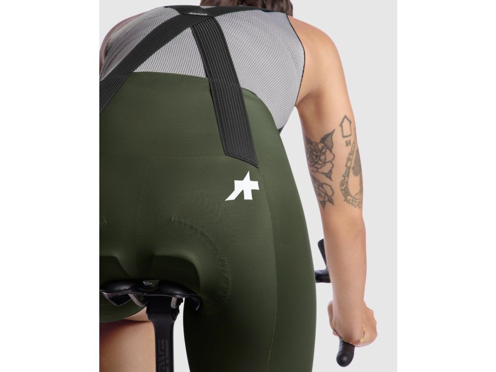Assos UMA GT Bib Shorts S11, Moss Green Dámske komfortné cyklistické nohavice s trakmi